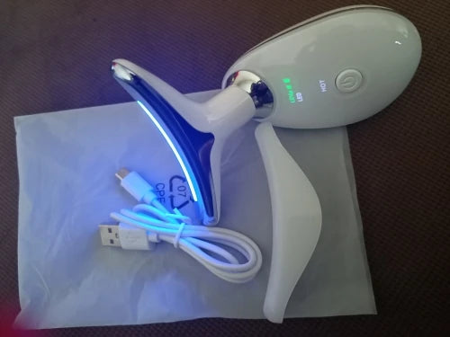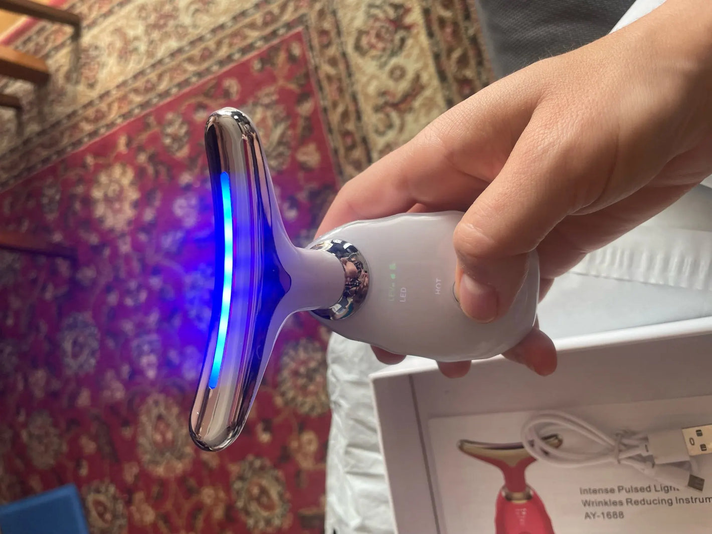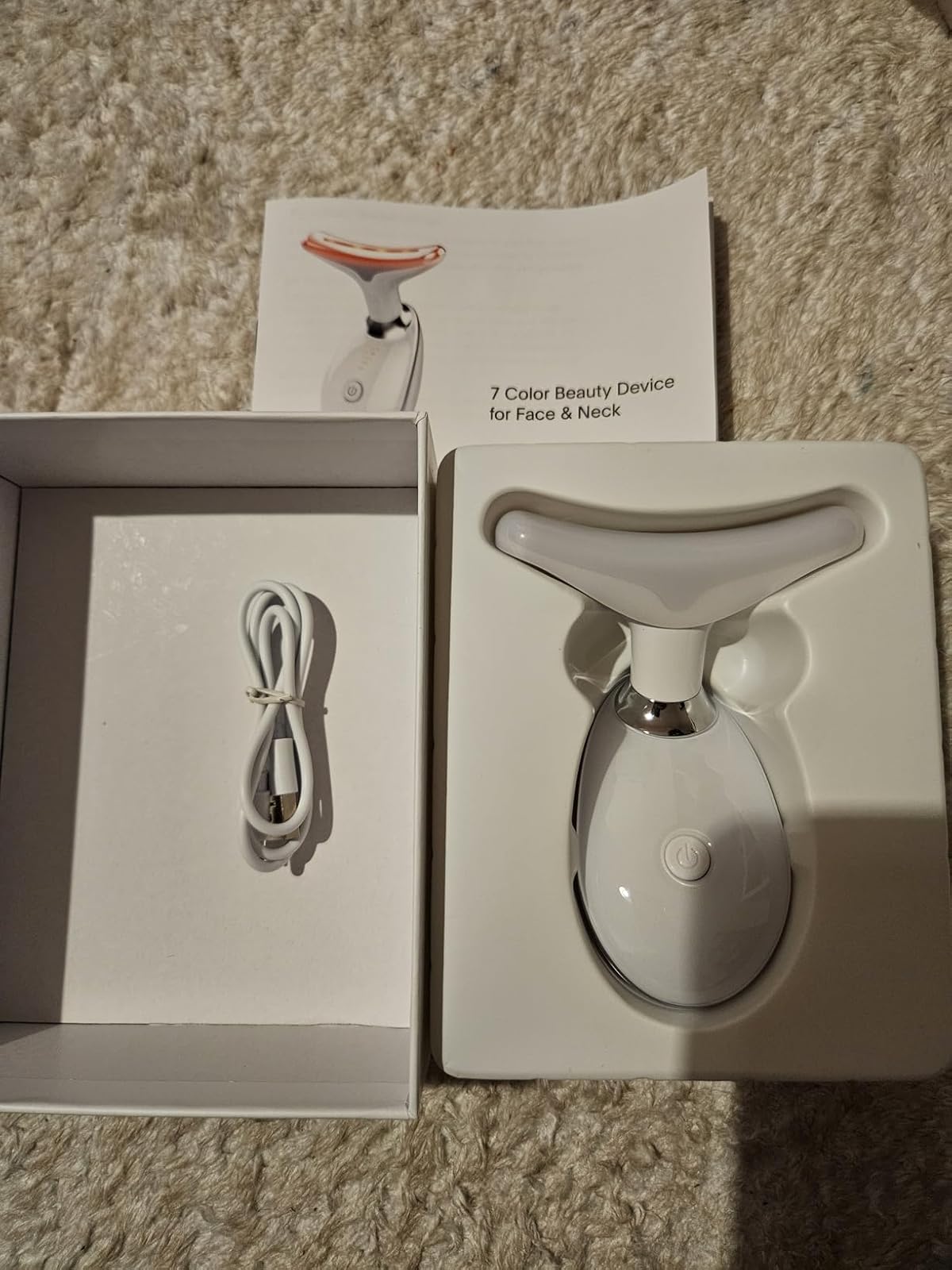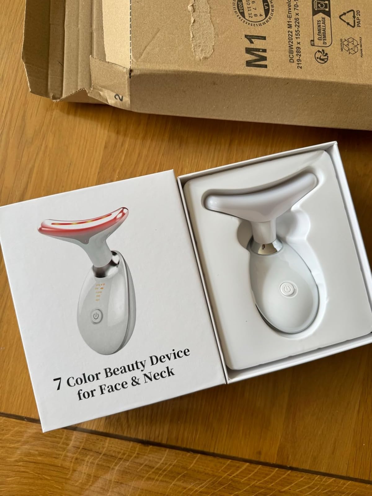 The shipment arrived ahead of time. Massager very cool and handheld. You can relax and de-stress. The blue light is the strongest. Will it help toned the skin of the face and neck hard to say because you certainly need some time. I ordered two because one for my sister. I am satisfied and I recommend to try.