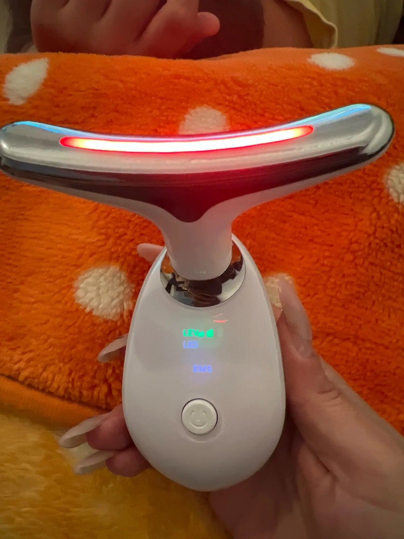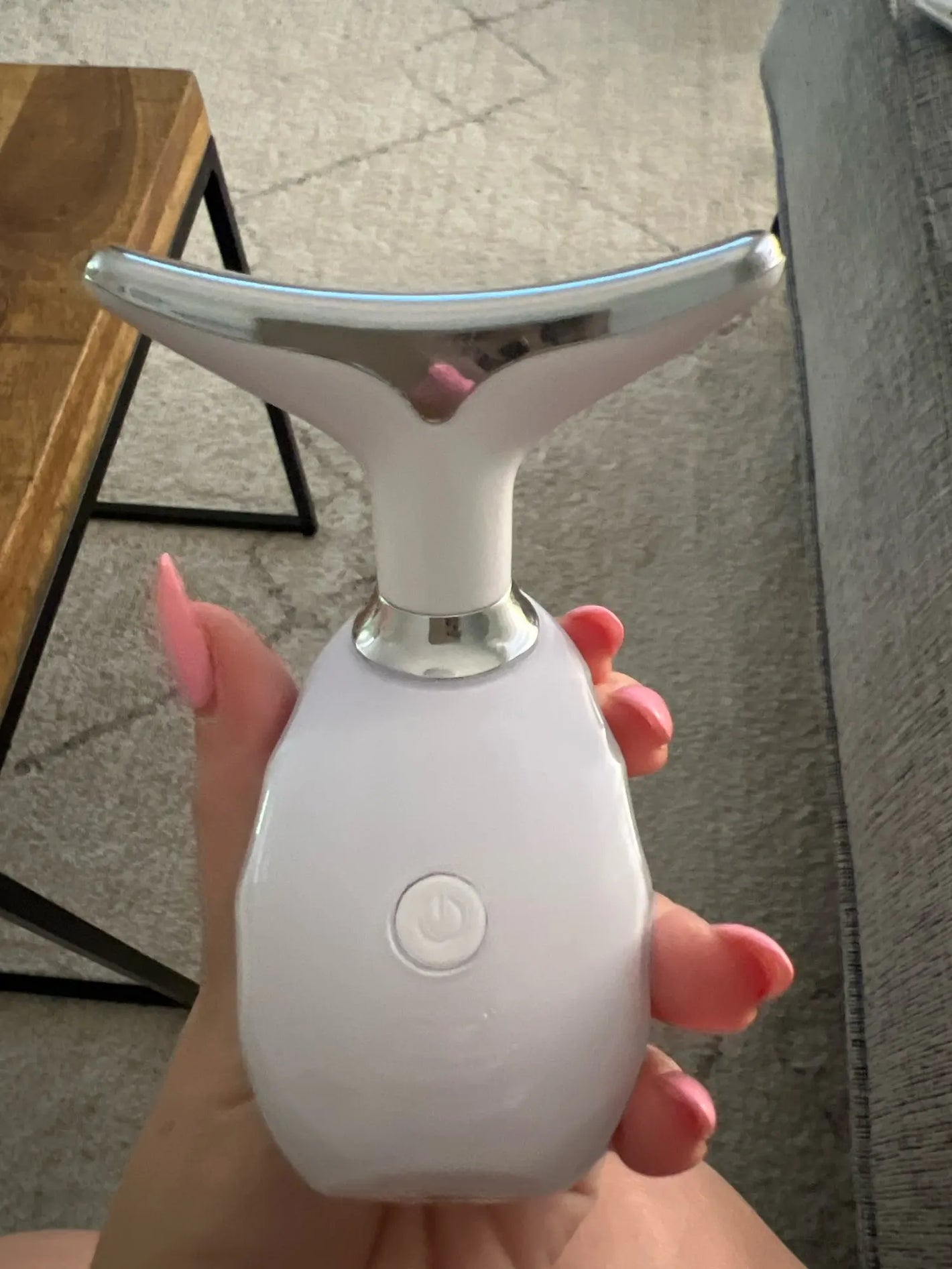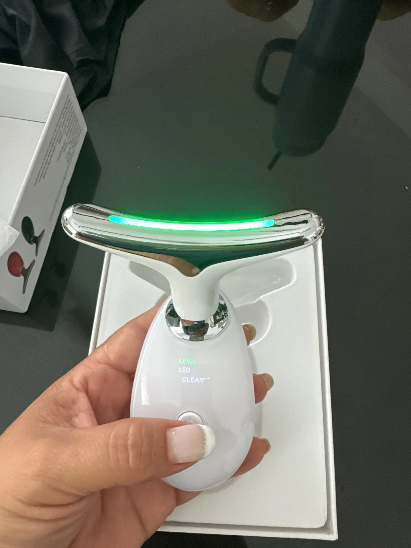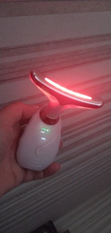 The shipment arrived ahead of time. Massager very cool and handheld. You can relax and de-stress. The blue light is the strongest. Will it help toned the skin of the face and neck hard to say because you certainly need some time. I ordered two because one for my sister. I am satisfied and I recommend to try.